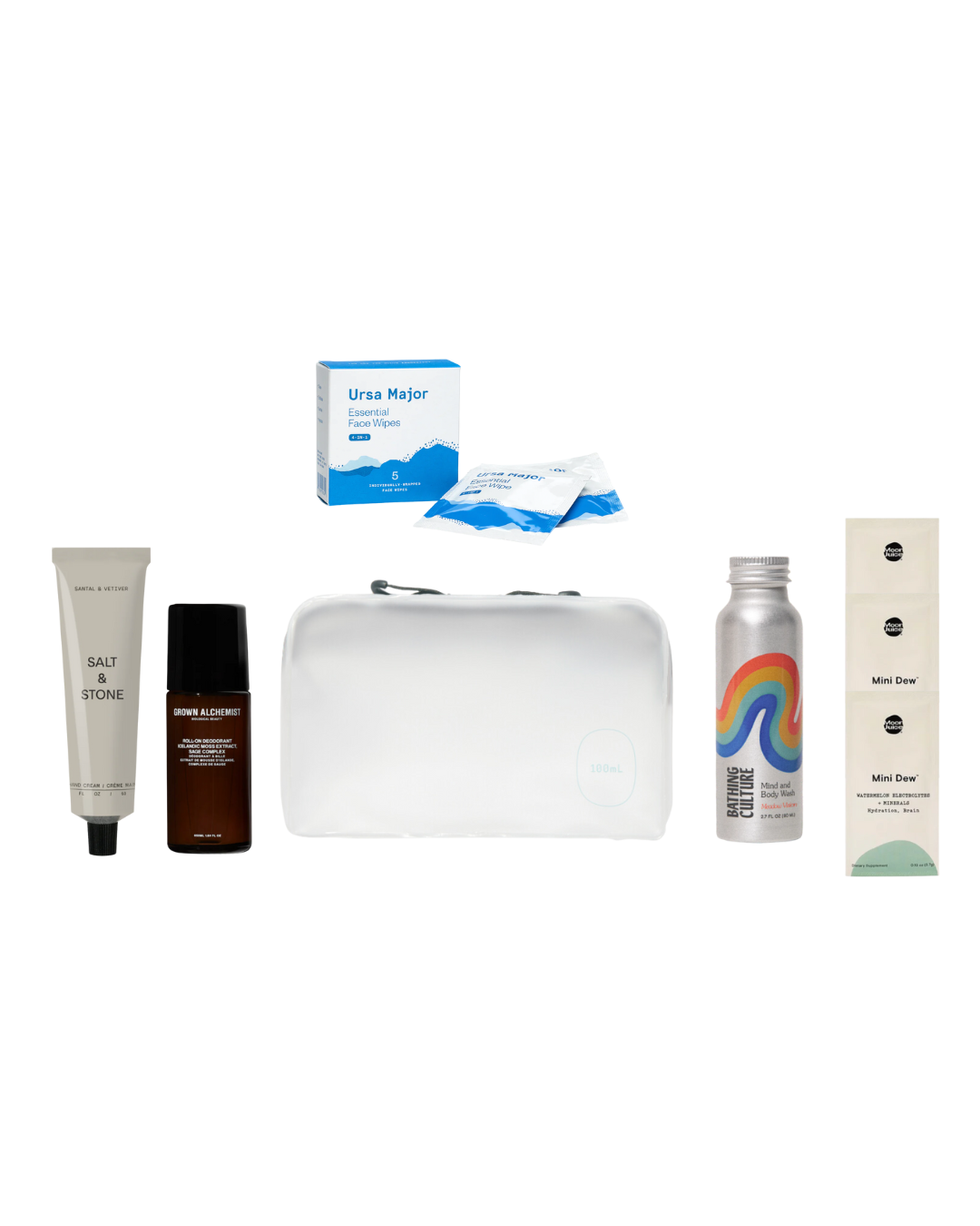 Inside the pouch: Ursa Major Essential Face Wipes, Grown Alchemist Roll-On Deodorant, Salt & Stone Hand Cream (Santal & Vetiver), Bathing Culture Body Wash, Moon Juice Mini Dew Electrolytes, 100mL signature pouch