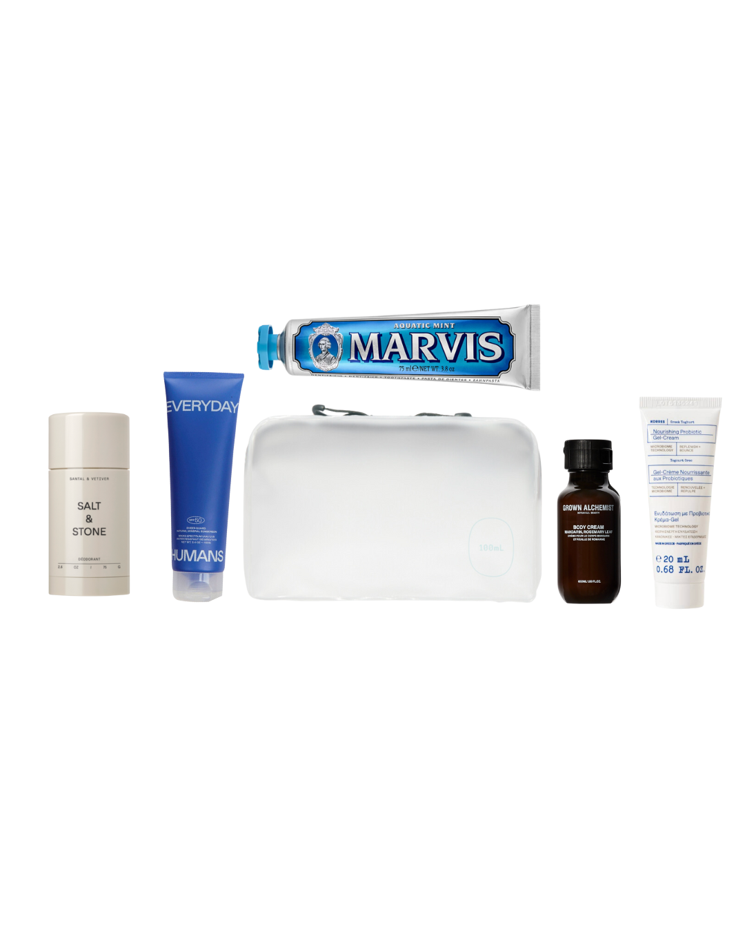 Salt & Stone Natural Deodorant (Santal & Vetiver), Everyday Humans SPF 30, Marvis Aquatic Mint Toothpaste, Grown Alchemist Body Cream, Korres Gel-Cream Moisturizer. 100mL signature pouch